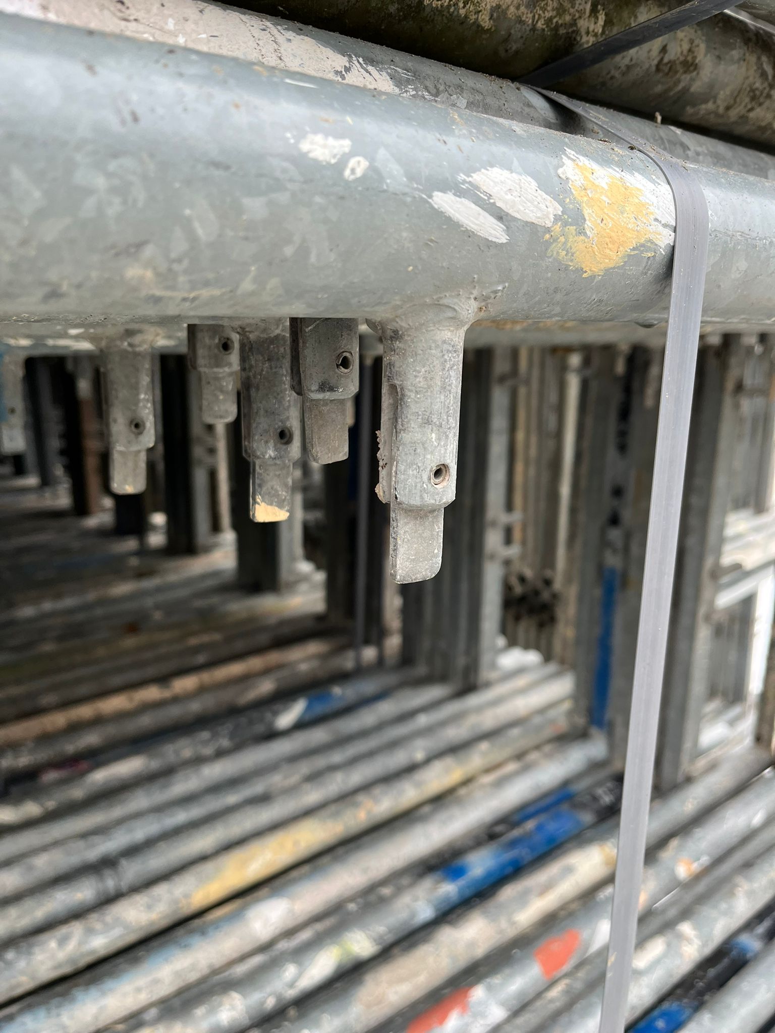 Oceľová rúrka Ø 48,3 mm x 2,7 mm, žiarovo pozinkovaná s guľatými tŕňmi pre zavesenie 2 drevených resp. kovových podláh. Pre ťahovo pevné spojenie v hornej a spodnej časti prevŕtané. Samoistiace spojky so sklopným čapom pre upevnenie zábradlia a diagonál.